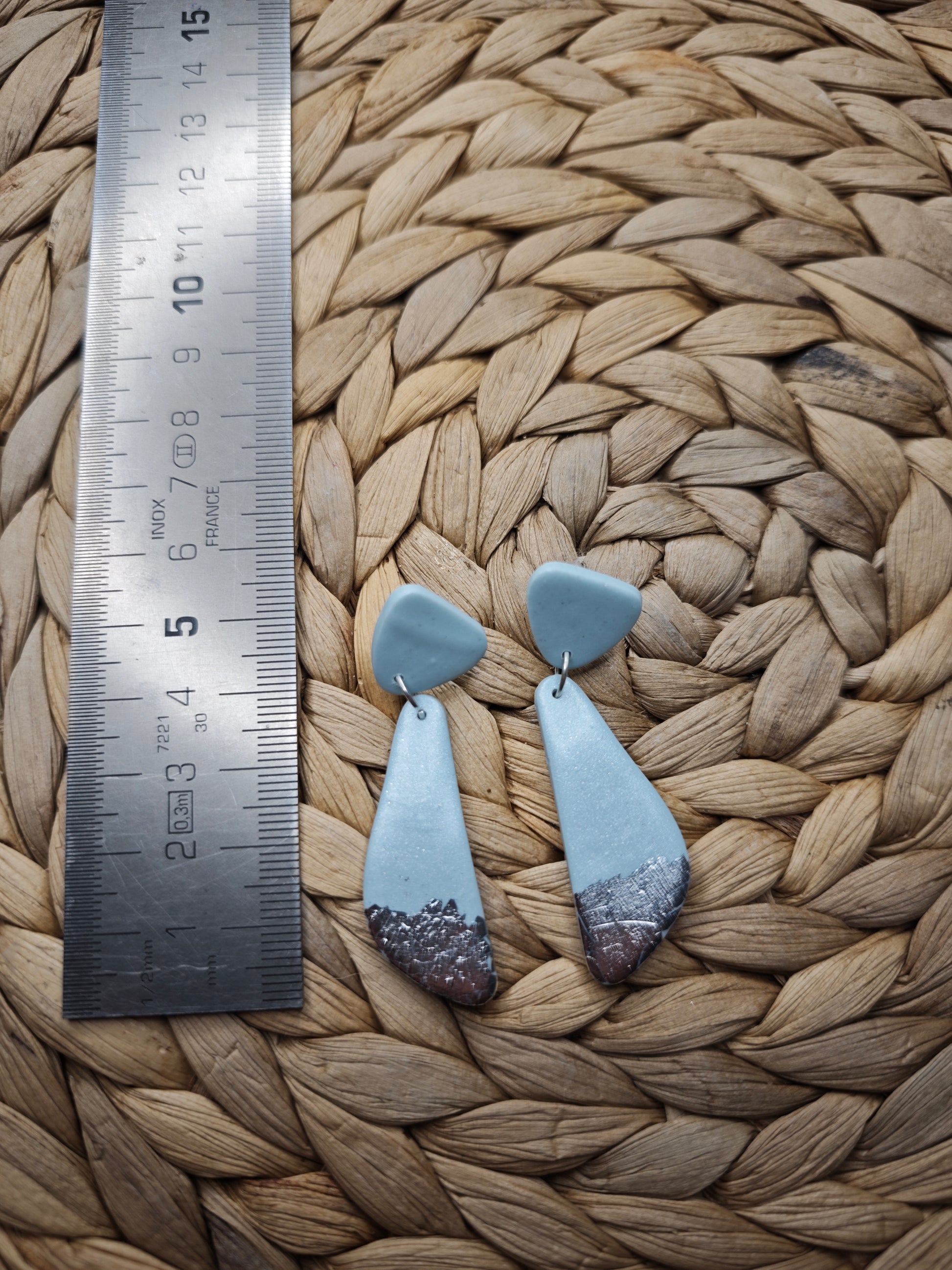 Stijlvolle lichtblauwe oorbellen met zilverkleurige afwerking. Handgemaakt van polymeerklei in druppelvorm, lichtgewicht en elegant.