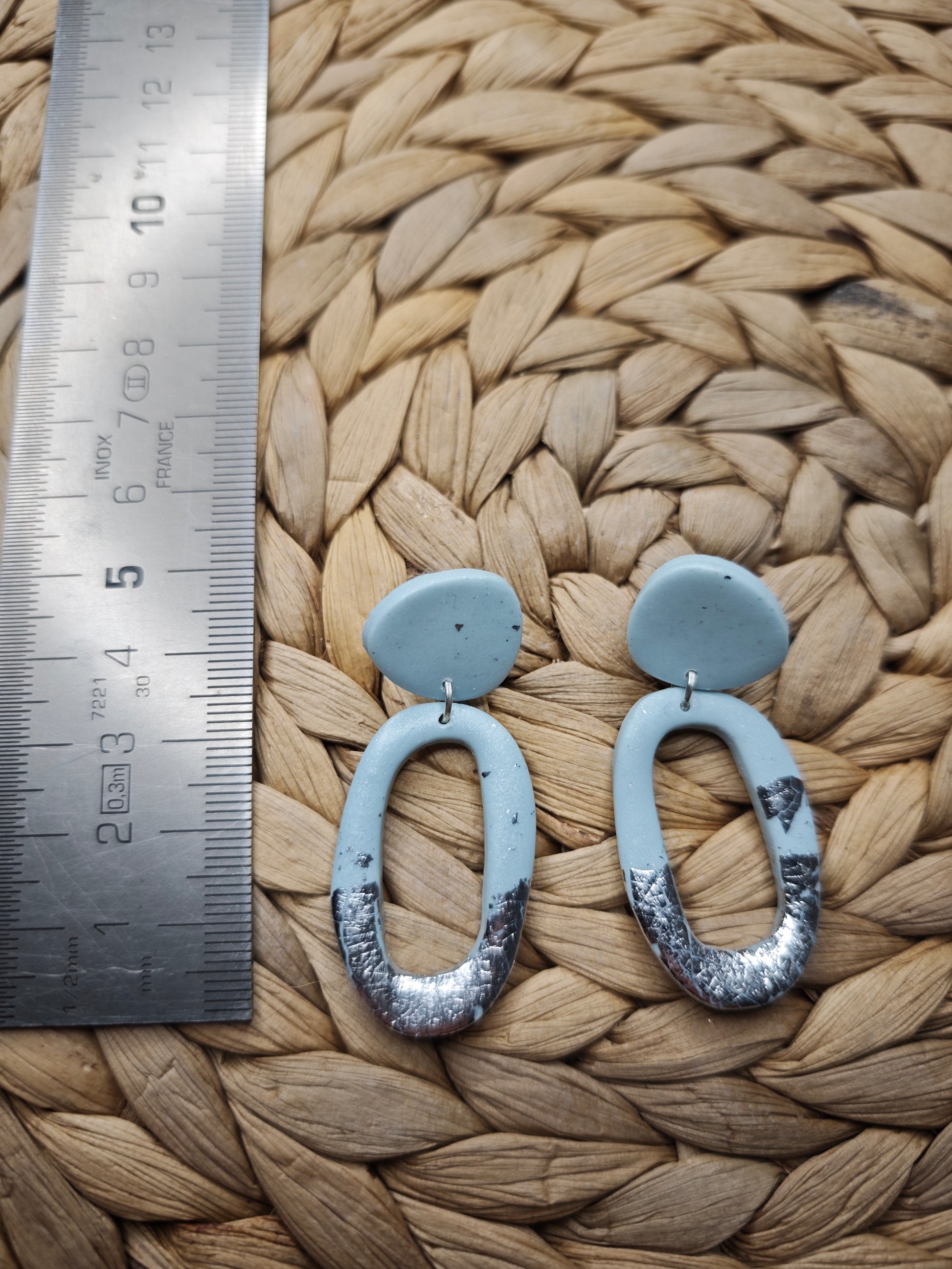 Elegante lichtblauwe oorbellen met subtiel zilverfolie detail. Handgemaakt van polymeerklei in ovale vorm, perfect voor een frisse, moderne look.